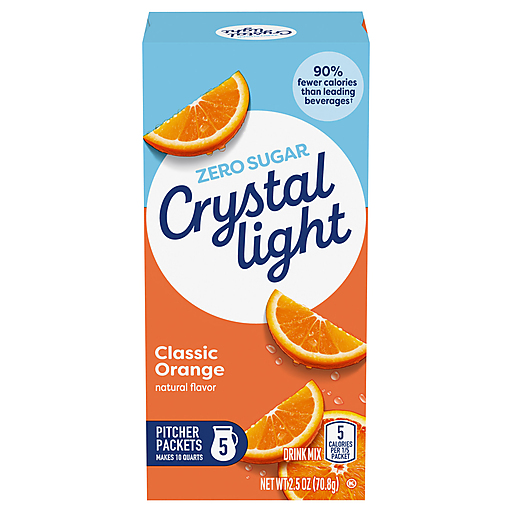 Crystal Light Naturally Flavored Classic Orange Powdered Drink Mix is a refreshing beverage you can enjoy at any time of day. With zero grams of sugar and only 5 calories per serving, Crystal Light is a sweet alternative to juice and soda and has 90 percent fewer calories than leading beverages (this product 5 calories, leading beverages 70 calories), so you don't have to choose between taste and calories. It's also made with natural flavors for a refreshing, energizing taste. Each pitcher packet of powdered orange drink mix in this 5 count canister is perfectly portioned to make 2 quarts or 1 pitcher of Crystal Light sugar free orange drink, so there's plenty to share with family and friends. Simply mix one orange drink packet with 8 cups or 2 quarts of water, stir, and enjoy! All the flavor and only 5 calories... just the way you like it.