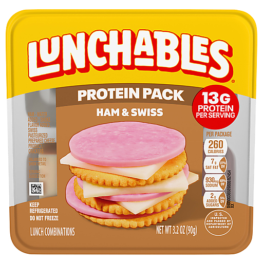 Have fun with lunch! Lunchables Ham & Swiss Protein Pack lets kids eat it their way — no prep needed! Each 3.2-ounce pack contains ham with water and smoke flavor added and Swiss pasteurized prepared cheese product that are perfectly paired with buttery, flaky crackers featuring the perfect combo of salty and sweet flavor. Packed with protein and fun in every bite, each serving contains 13 grams of protein. Our Lunchables kit tastes great and is perfect as part of school lunches, weekend bites or any time hunger strikes. The real win is that kids get to make it and eat it their way! Keep Lunchables refrigerated until you're ready to enjoy.