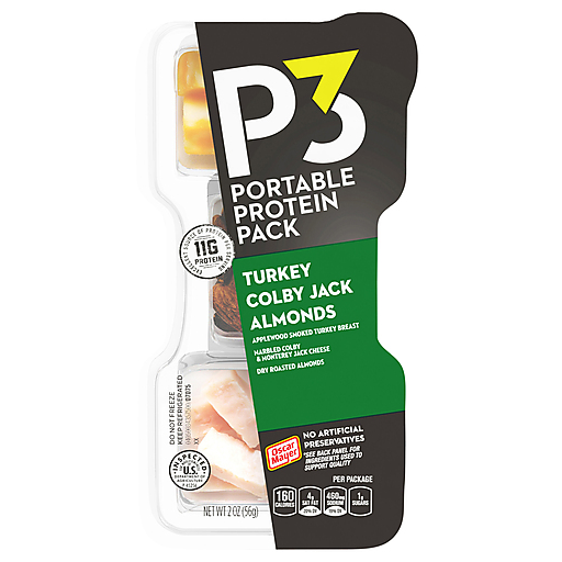 Oscar Mayer P3 Turkey, Almonds and Colby Jack Portable Protein Packs shake up your snacking routine with a deliciously convenient protein snack pack. Each pack contains snack-sized portions of applewood smoked turkey breast, dry roasted almonds and marbled Colby and Monterey Jack cheese. P3 is an excellent source of protein, with 12 grams per serving. Ready to eat right from the fridge, these individual protein snacks are a delicious source of energy when you need a boost. Keep P3 refrigerated/ chilled until ready to enjoy. Oscar Mayer P3 trays are a great choice for those following a low carb lifestyle. Our 2 ounce plastic portable meat and cheese trays are easy to open when you are on-the-go. P3 Portable Protein Packs are the more interesting way to get your protein.